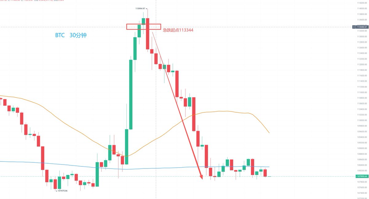 近两天一直在强调BTC价格的"两大一小"的运行区间,其中前天的文章提示了若价格急涨至113344,则会诱发急跌,盘中最高到113994就瀑布,夜间的走势就是最完美的演绎。
