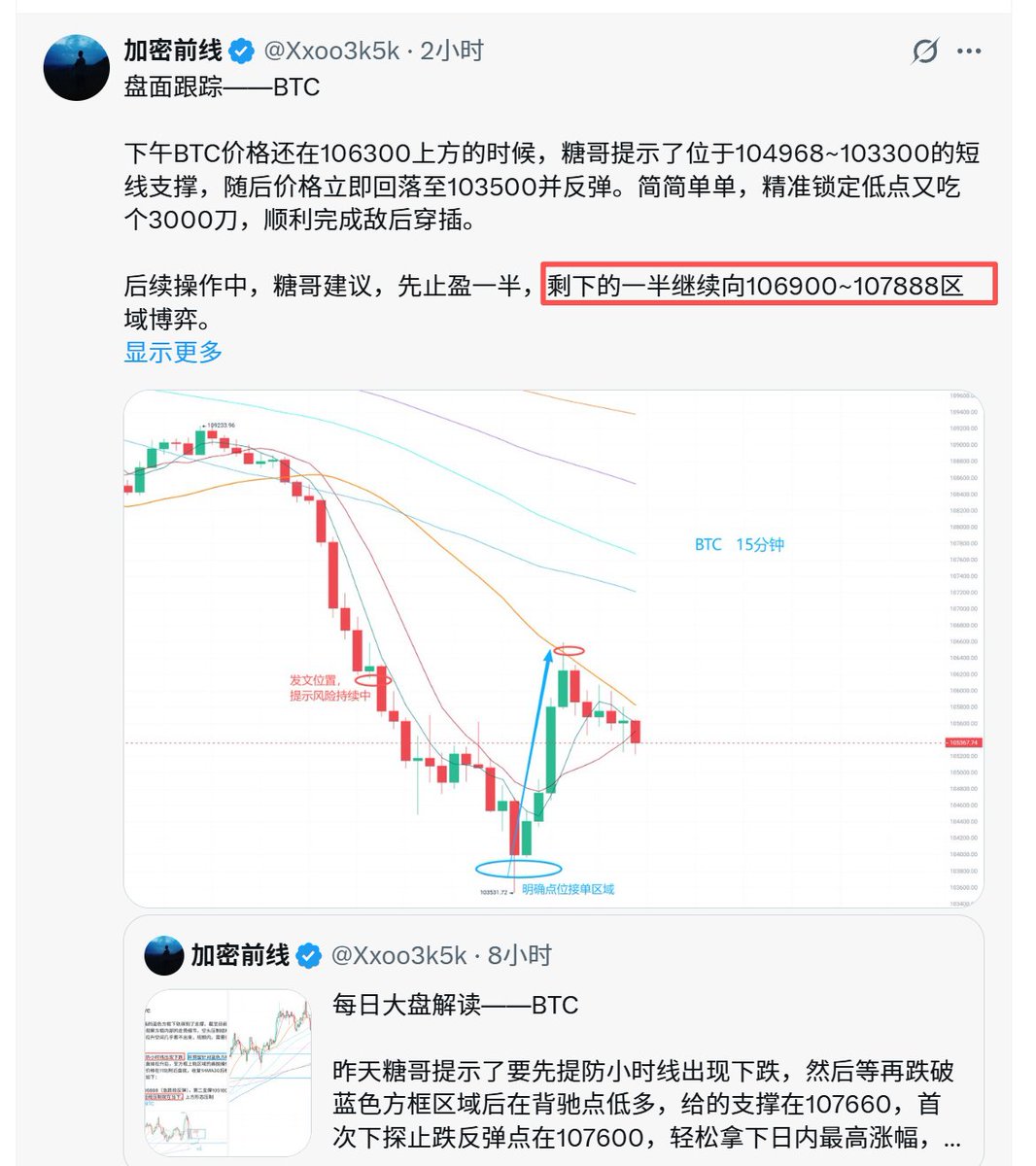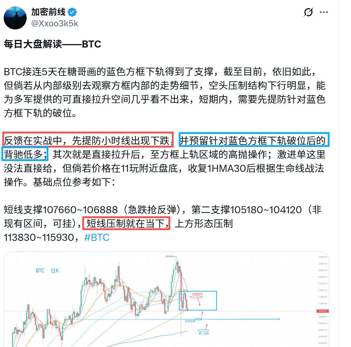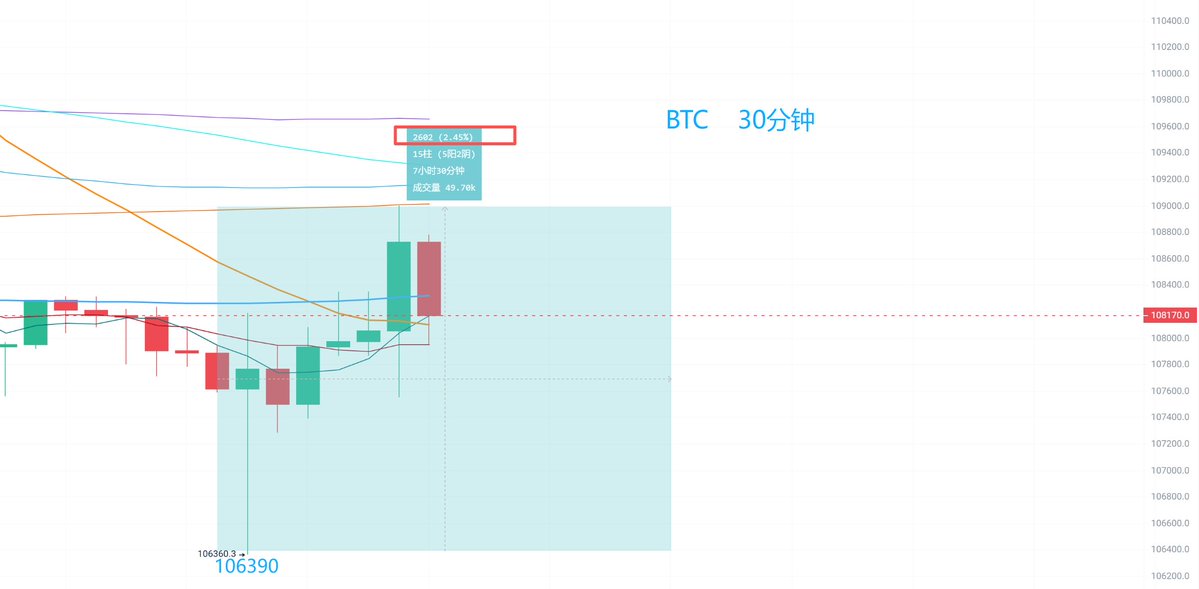短线支撑106310~105860(缓跌可入,急跌不进),第二支撑104912~104033(可挂),当前位置及上方都属于形态压制范围,很难有持续性,小级别空军的第一个抵抗范围在108680~109270,前文短线支撑又接到的小伙伴反抽成本附近出。#BTC