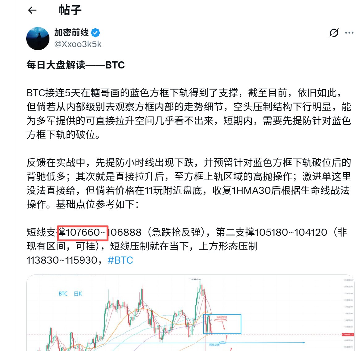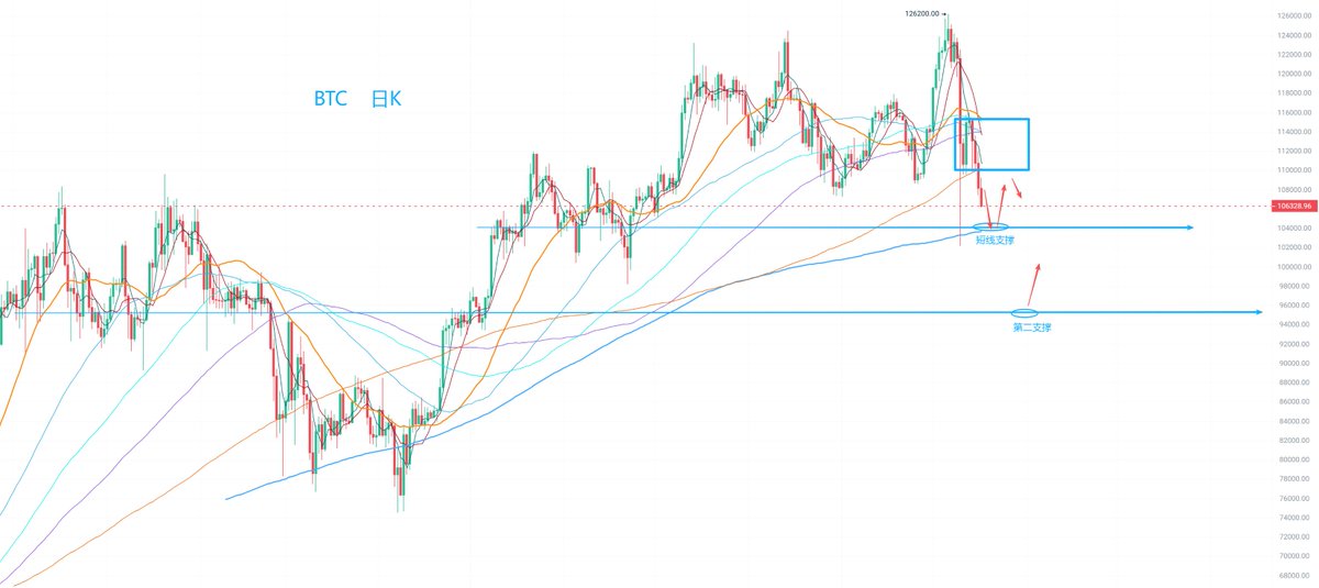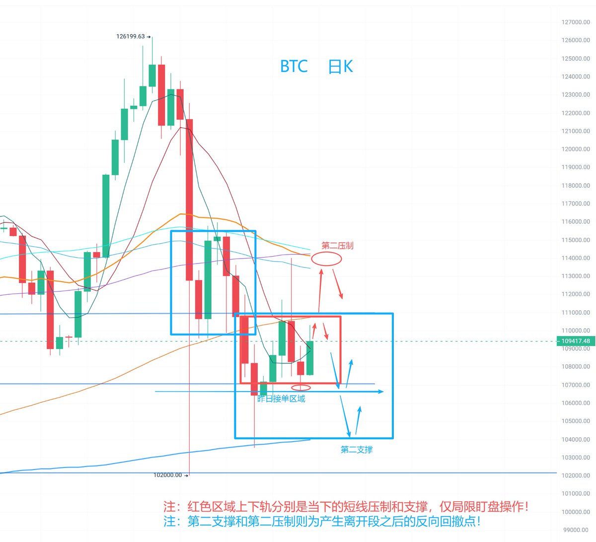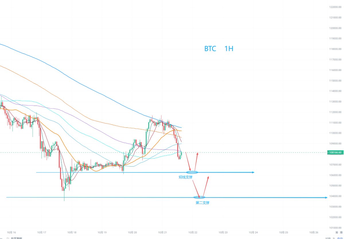 短线支撑107766~106750(缓跌可做),第二支撑104640~103580(可挂)