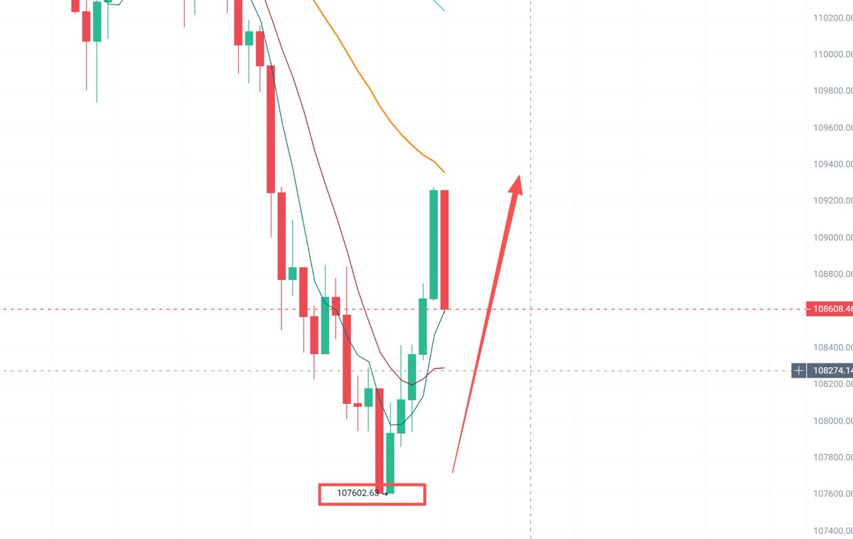 昨天糖哥提示了要先提防小时线出现下跌,然后等再跌破蓝色方框区域后在背驰点低多,给的支撑在107660,首次下探止跌反弹点在107600,轻松拿下日内最高涨幅,走势符合预判。