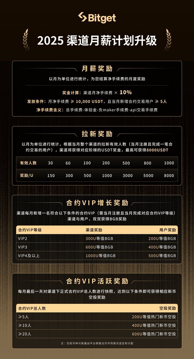 简单点说就是:你的账号本月手续费≥1万U,且有5个新增合约用户,即可获得1000U的直接奖金。以及叠加获得拉新奖励+合约VIP活跃增长奖励+合约VIP活跃奖励。#Bitget