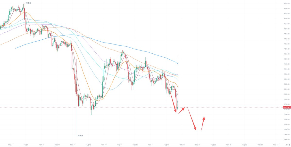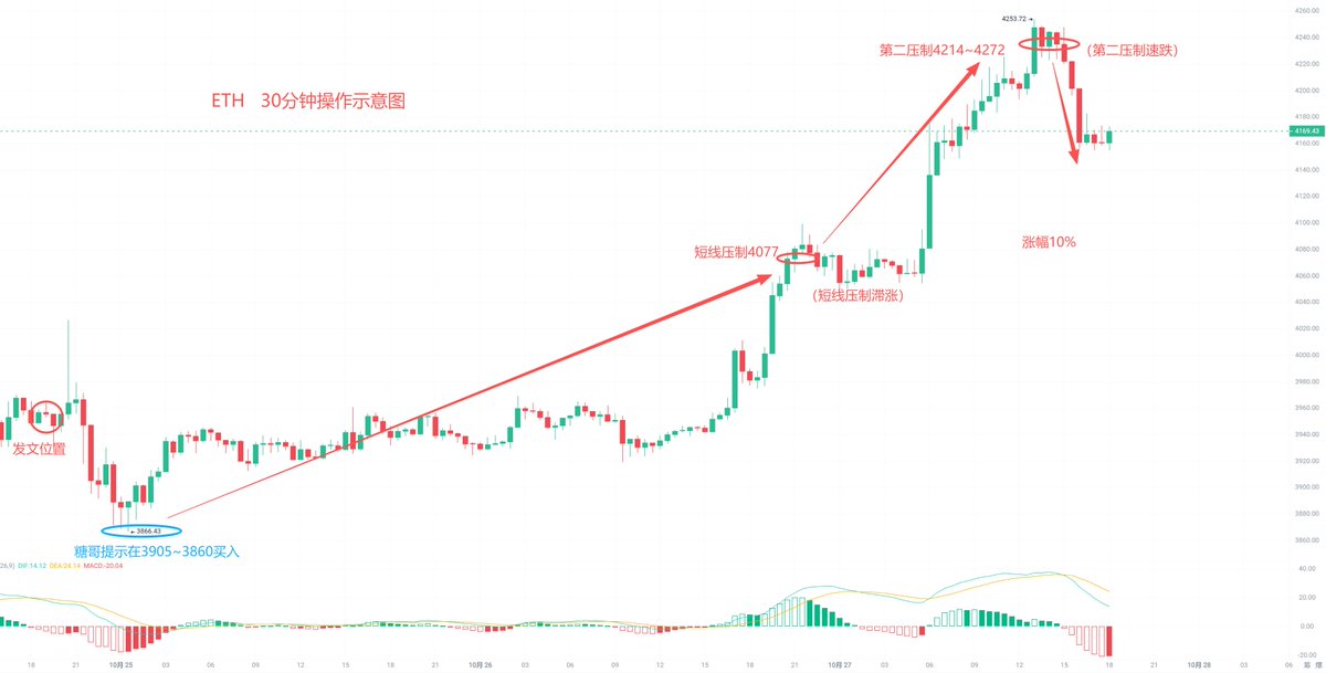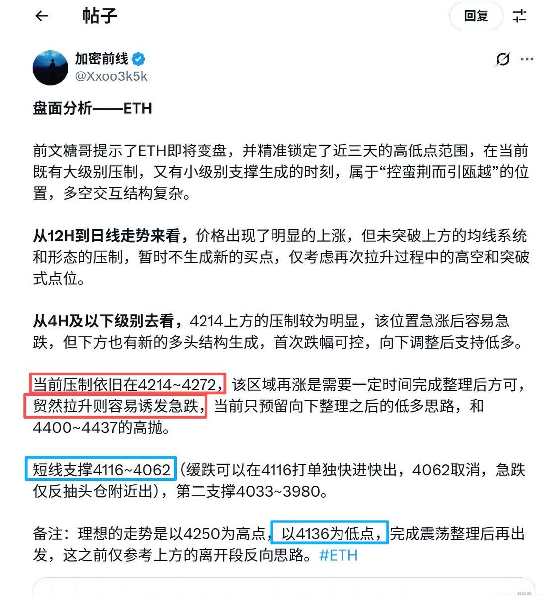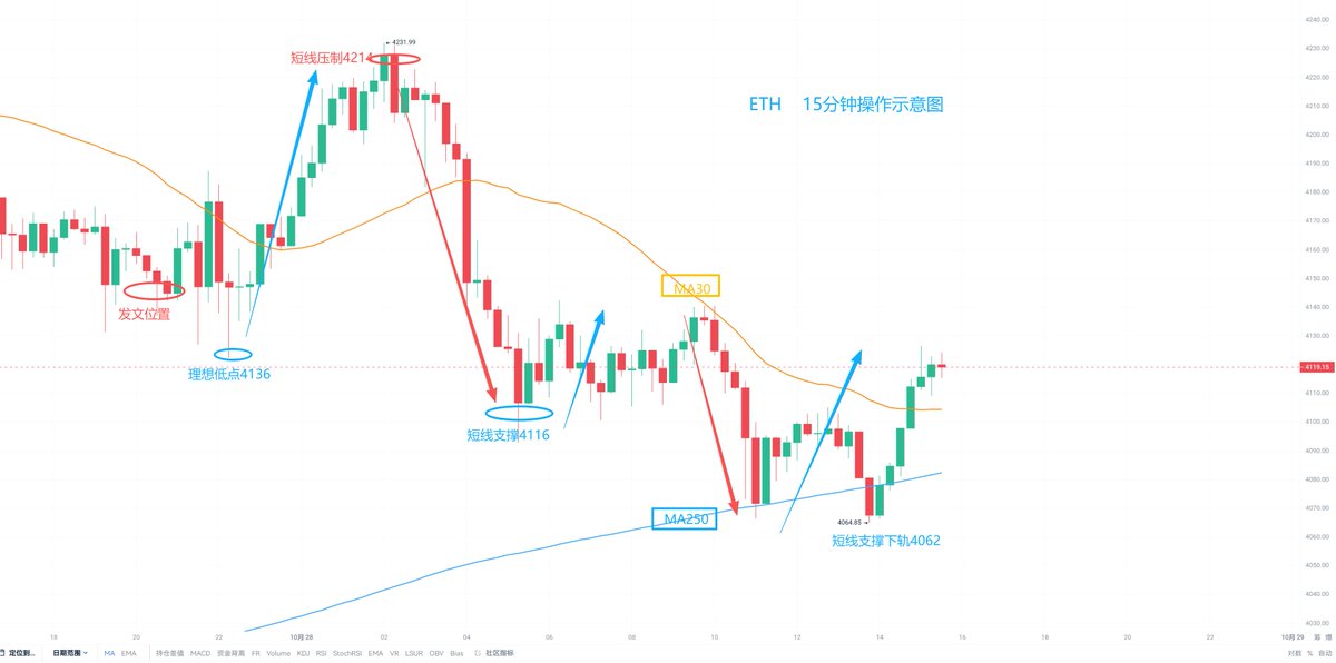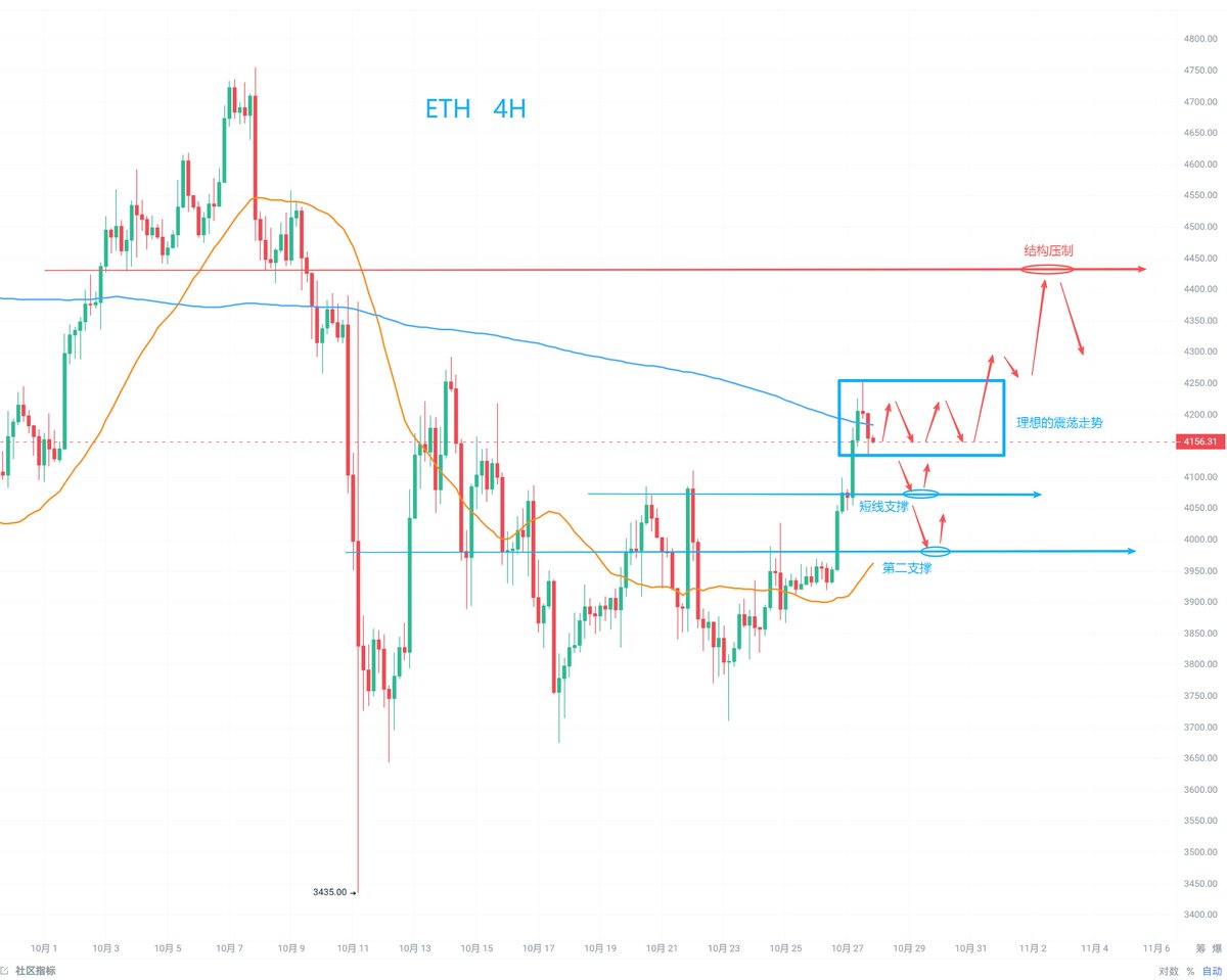 备注:理想的走势是以4250为高点,以4136为低点,完成震荡整理后再出发,这之前仅参考上方的离开段反向思路。#ETH