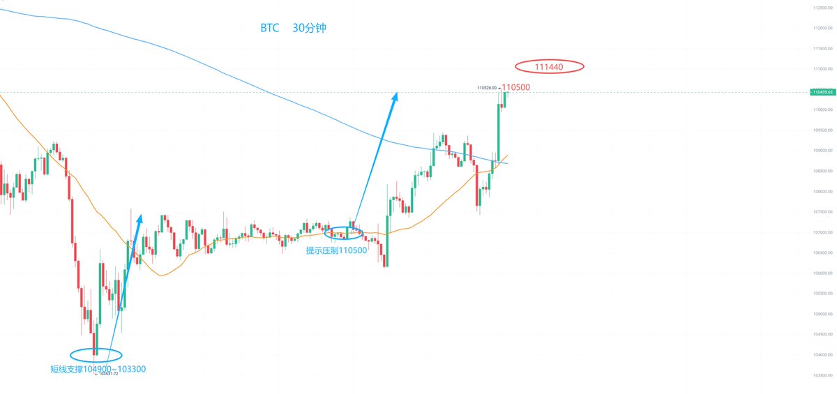 (1)短周期压制在113180~114277,抵达压制后回踩111755~110740可快进快出。