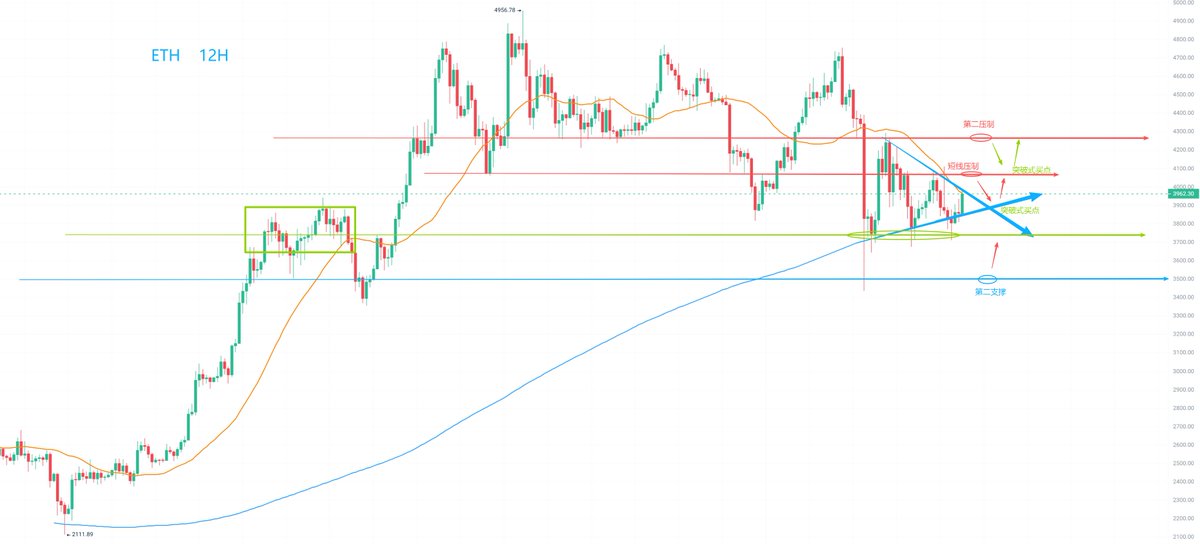 短线压制4077~4132(抵达该区域后回踩12H生命线战法买点可入,盯盘参考4000~3930),短线支撑3750,第二压制4214~4272,第二支撑3545~3452(1:2可挂)