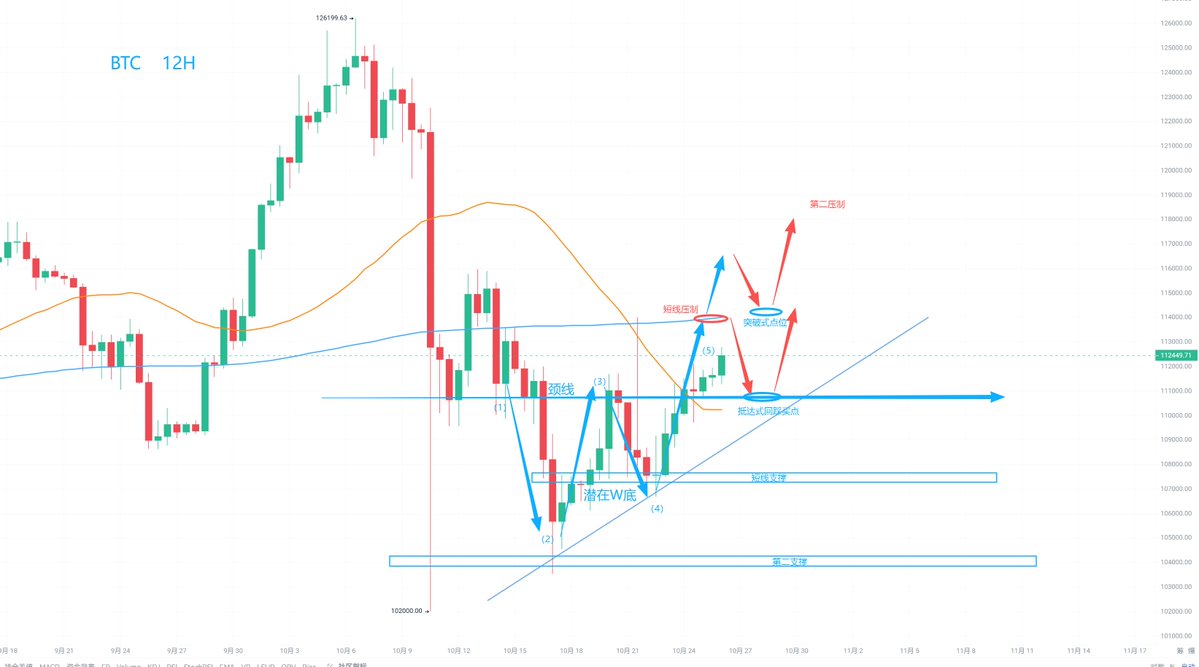 备注:周线还有上行空间的背景下,12H到日线的W底成型的概率很大,符合结构后的买点可以继续持仓博弈中线。#BTC