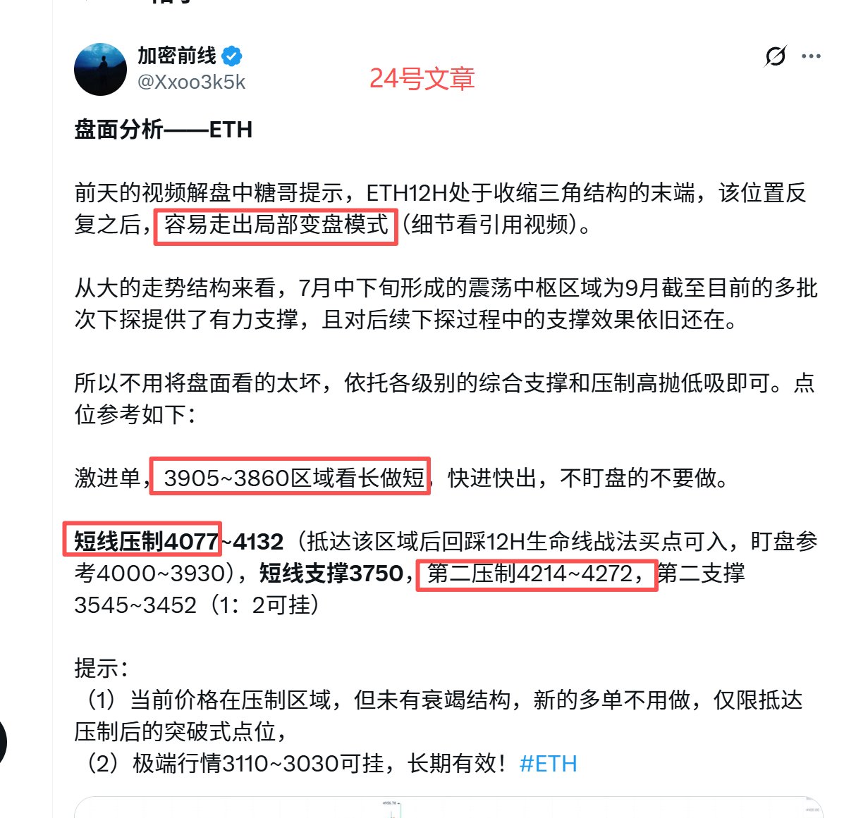 前文糖哥提示了ETH即将变盘,并精准锁定了近三天的高低点范围,在当前既有大级别压制,又有小级别支撑生成的时刻,属于“控蛮荆而引瓯越”的位置,多空交互结构复杂。
