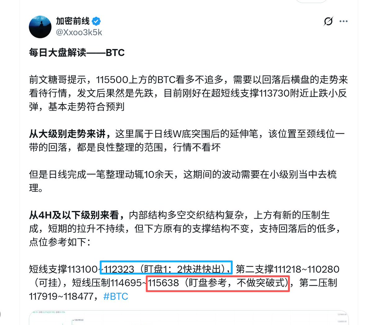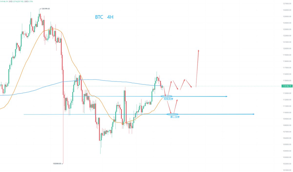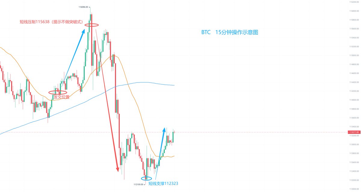 前文糖哥提示,115500上方的BTC看多不追多,需要以回落后横盘的走势来看待行情,发文后果然是先跌,目前刚好在超短线支撑113730附近止跌小反弹,基本走势符合预判