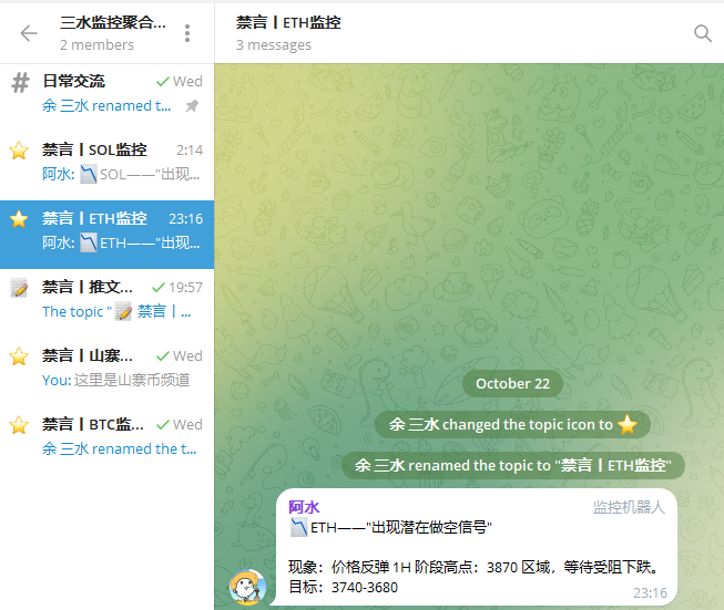 顺便打个广告——"接下来会开放一个监控聚合频道,包括 BTC/ETH/SOL 和山寨币,由设定的机器人自动播报,仅提供给 #Bitget 返佣用户"。