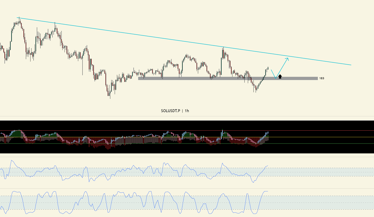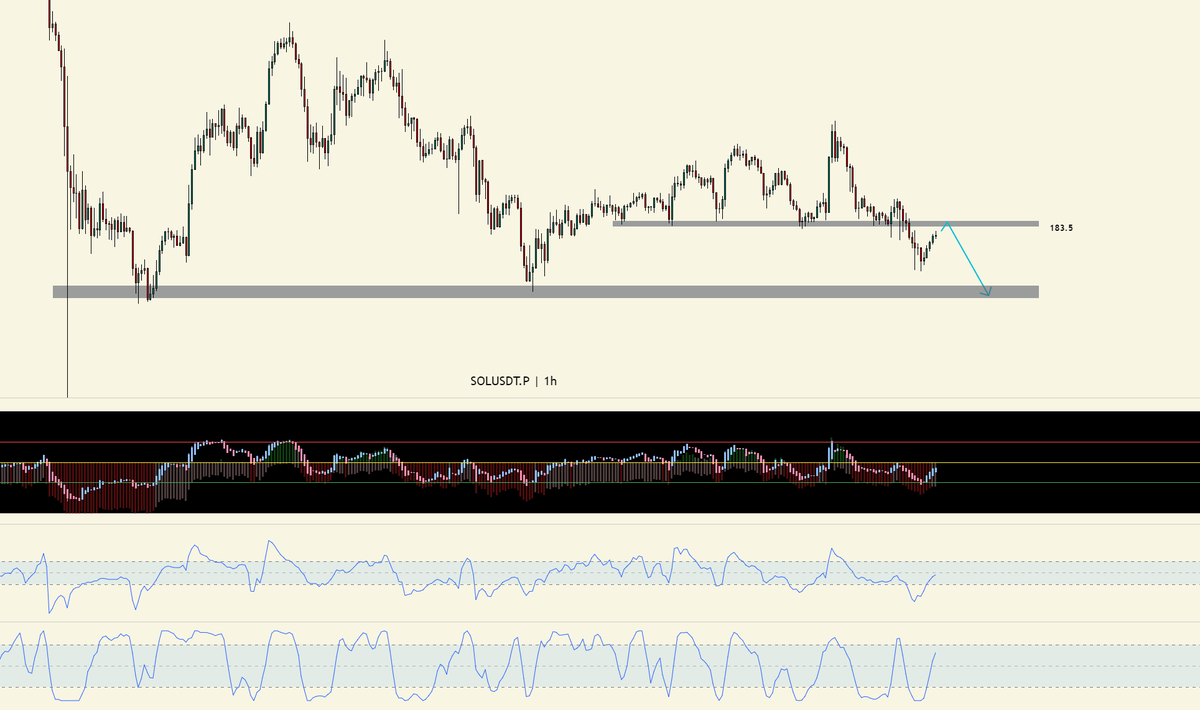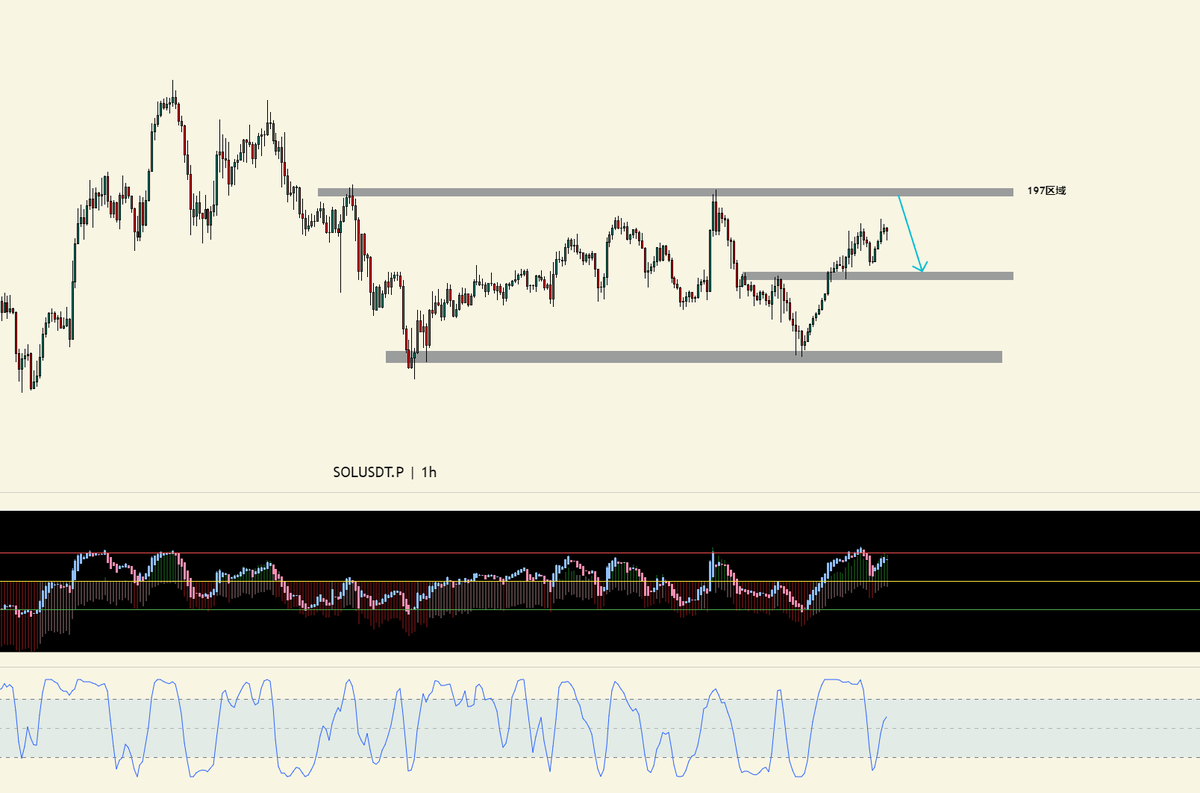 $SOL 目前主要看 183.5 这块,作为潜在阻力,具有反弹受阻的预期,目前结合指标看,还会再涨几段K柱,看到时候价格在 183.5 这块的受阻情况。