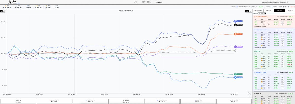 分别使用了gpt grok deepseek gemini等6个热门的llm做交易,目前deepseek和grok盈利最多,chatgpt和gemini处于亏钱状态