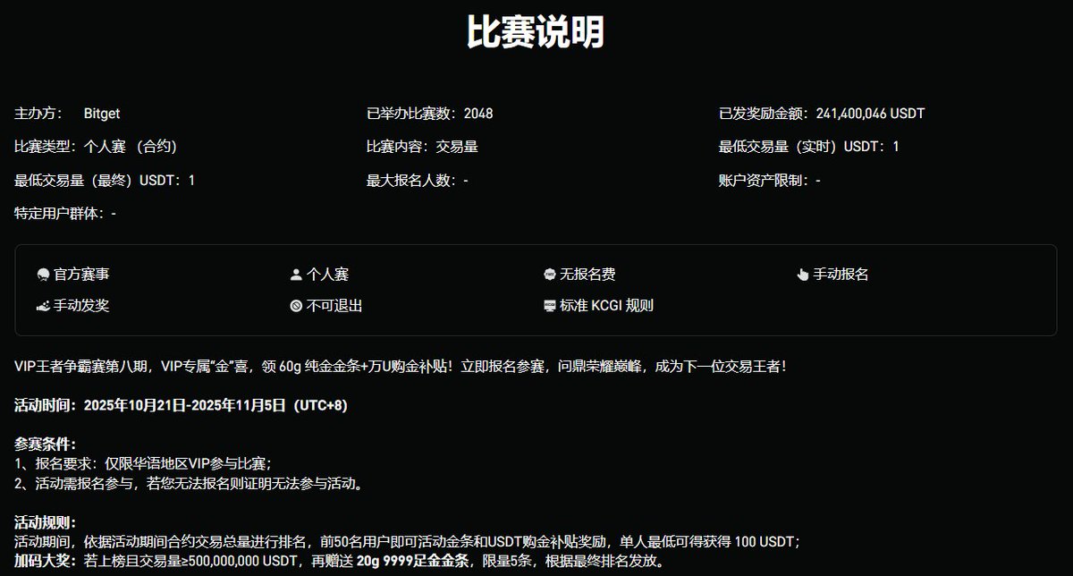 ✅VIP 王者争霸赛第八期,报名活动赢 VIP 专属“金”喜,领 60g 纯金金条+万 U 购金补贴!