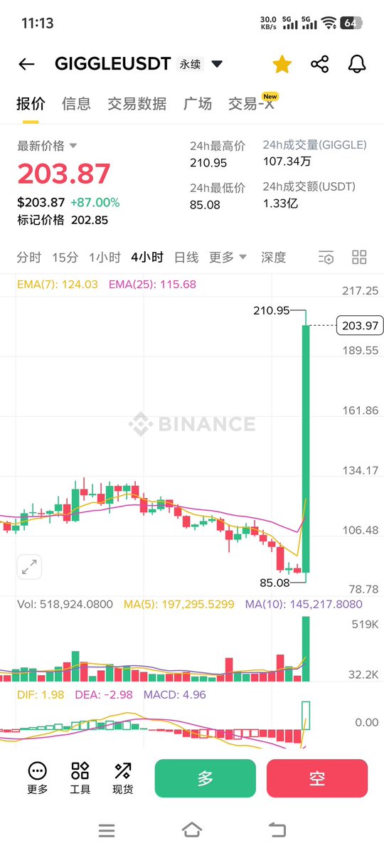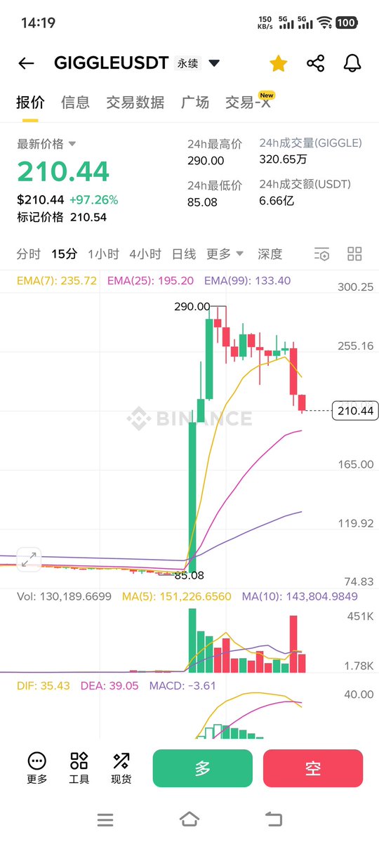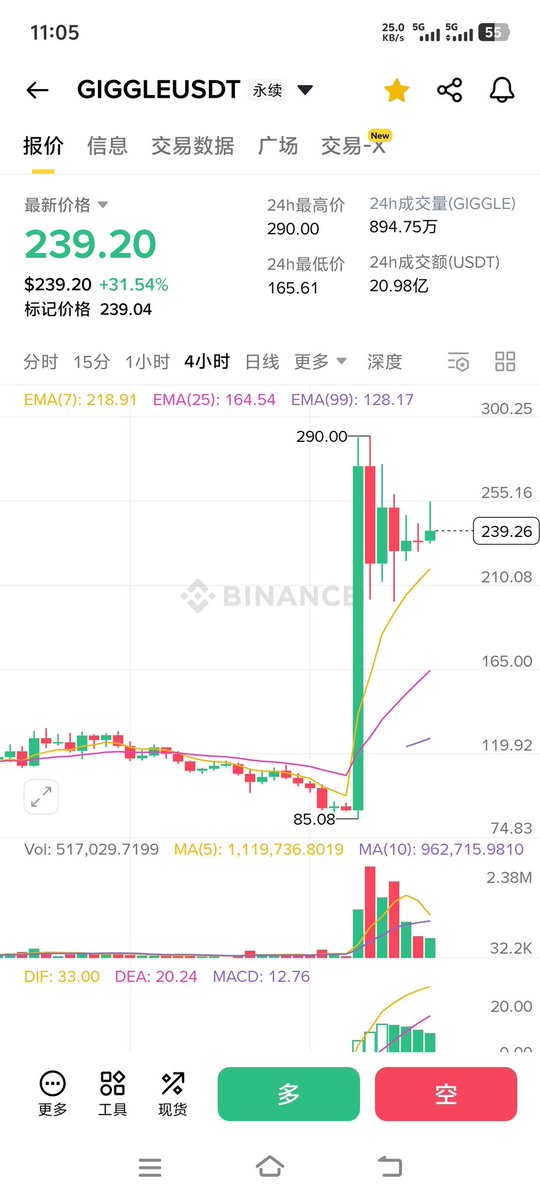 1⃣Giggle昨天公布上现货交易对后,价格瞬间拉升,最高点快300刀,目前回调横盘240附近,鱼哥认为第一个慈善概念Meme,一步步上来到现货,高点绝对不会止步于300M这里,空间还有,如果还有大回调机会可以继续买