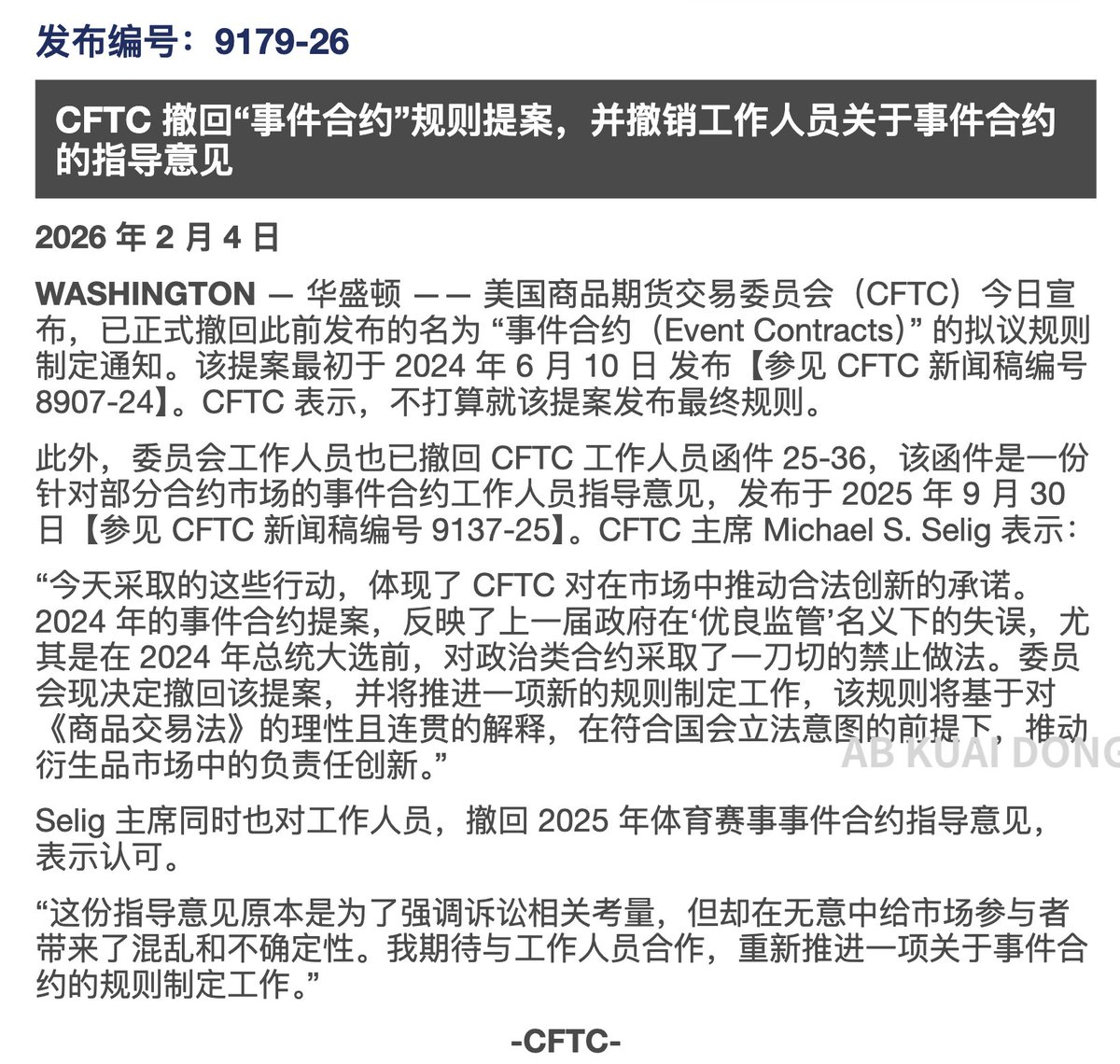 全民押注!预测市场最后的阻碍没了。 现任新的美国商品期货委员会,撤回了拜登政府时期,对事件合约进行管控的规则提案,尤其是政治类的预测合约,比如押注哪位领导人上台。 按照官方的说法,之前的监管搞乱了市场,阻碍创新,因此这次将不再一刀切,去禁止预测市场和事件合约。