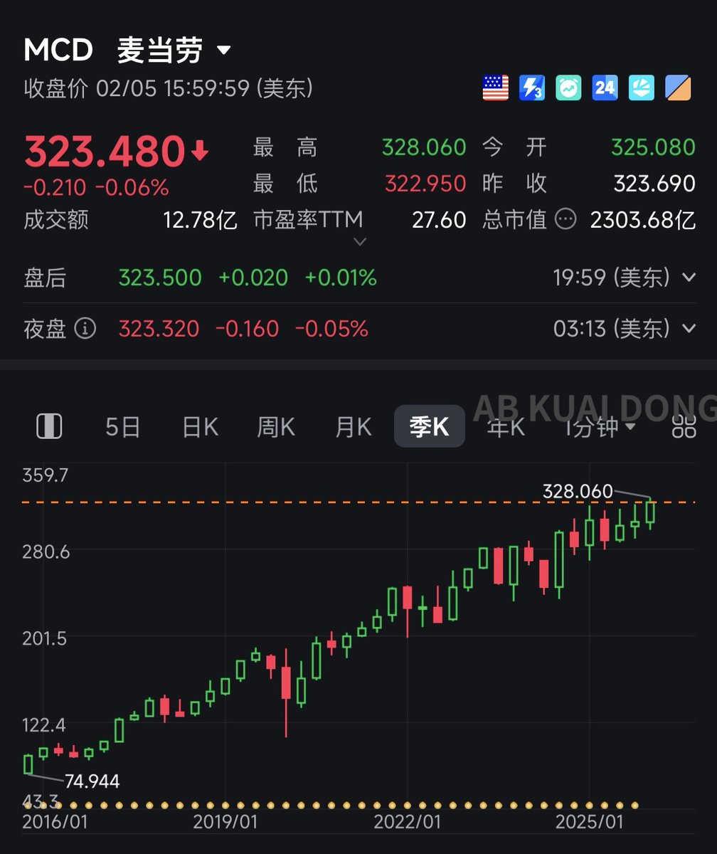 麦当劳的总市值已超过以太坊。 麦当劳 2303 亿,以太坊 2290 亿。 过去一年,麦当劳上涨约 10%,而以太坊却下跌 30% 。