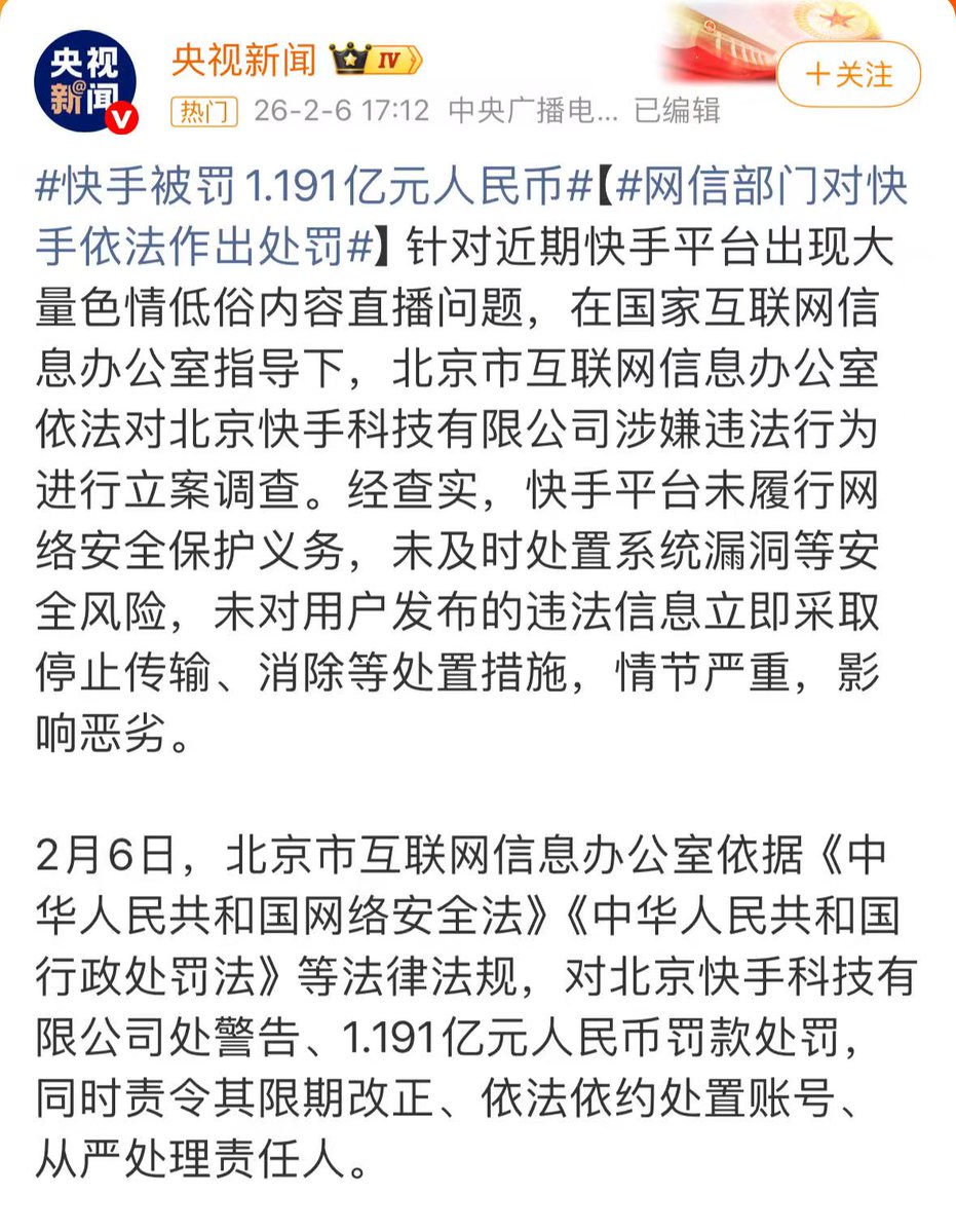 去年底快手被攻击,导致直播涉黄的事情,终于有下文了 网信办对快手罚了 1.19 亿人民币 原因是平台未及时处理漏洞,导致很多用户直播刷到了一堆黄片