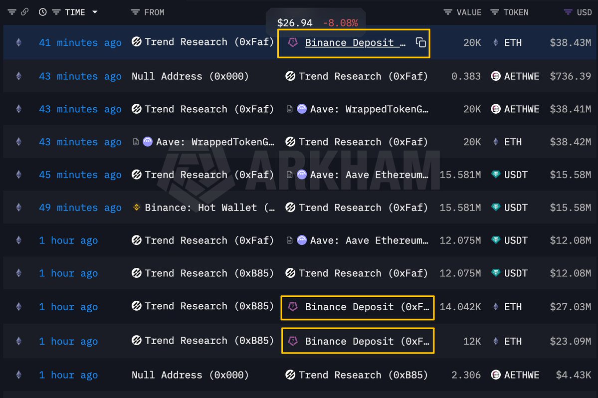 距离美股开盘,时间不多了。 易理华的 Trend Research,过去几小时,正疯狂向币安充值 ETH 进行抛售,然后将套现出的美元稳定币 USDT,偿还链上借的贷款中。 上一轮不断加杠杆买币的多头,在这轮下跌的清算潮中,成了卖币去杠杆的空头。