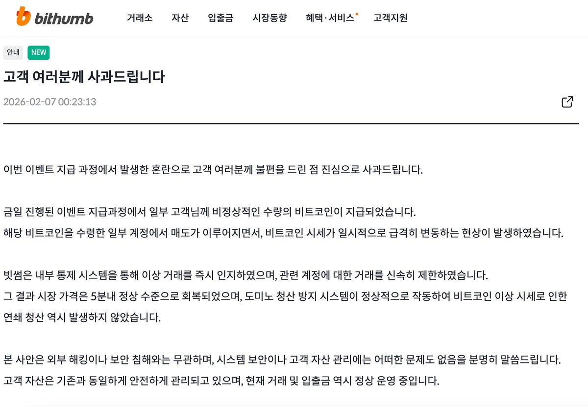 Bithumb 刚刚发布道歉公告,进一步证实了这个事情。 工作人员将 2000 枚比特币,当作 2000 韩元,给用户发出去当奖励了,同时也承认有部分用户,把这些比特币卖出套现。 目前,他们冻结了这些收到比特币的用户。 2026 开年第一场闹剧。