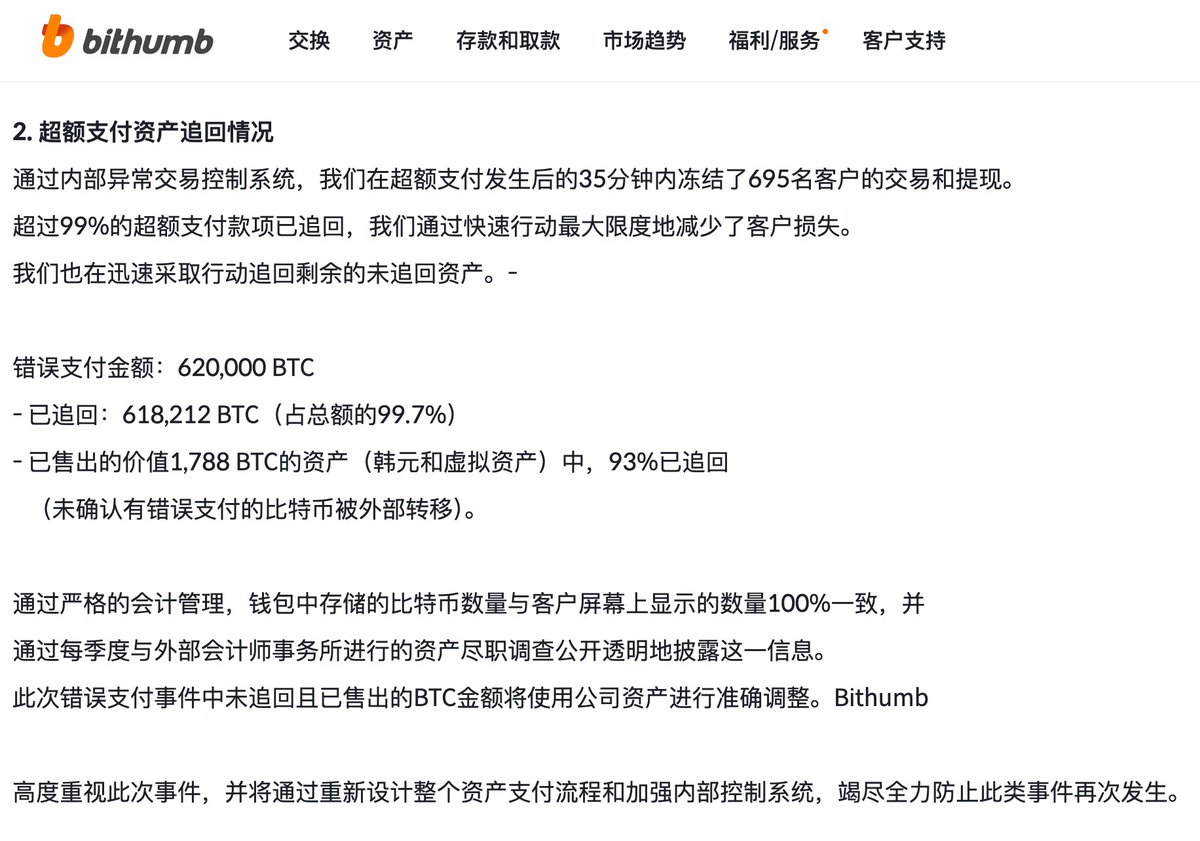 事件后续: Bithumb 实际上误发了 62 万枚比特币,给用户。相当于每个用户,获得了 2000 枚比特币。 但该交易所,却只有 4.6 万枚比特币真实储备。 目前他们追回了其中的 99.7%,然后 1788 枚比特币,被用户拿到后立即卖出,但随即 93% 被平台收回。 也就是说还是有 125 枚比特币,被变现跑了。