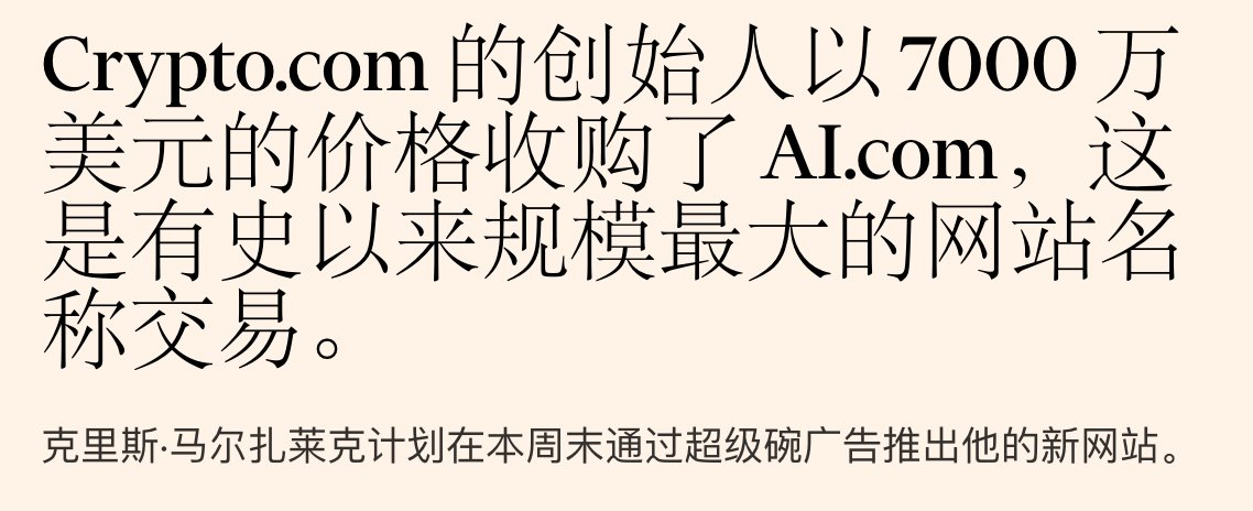 币圈交易所 Crypto com 的创始人,花了 7000 万美金,购买了 AI com 的域名。。 接下来是不是,又是当年的打广告、包装、融资路线了,怎么那么熟悉。 这是过去一周,第三个币圈老哥去搞 AI 的消息。