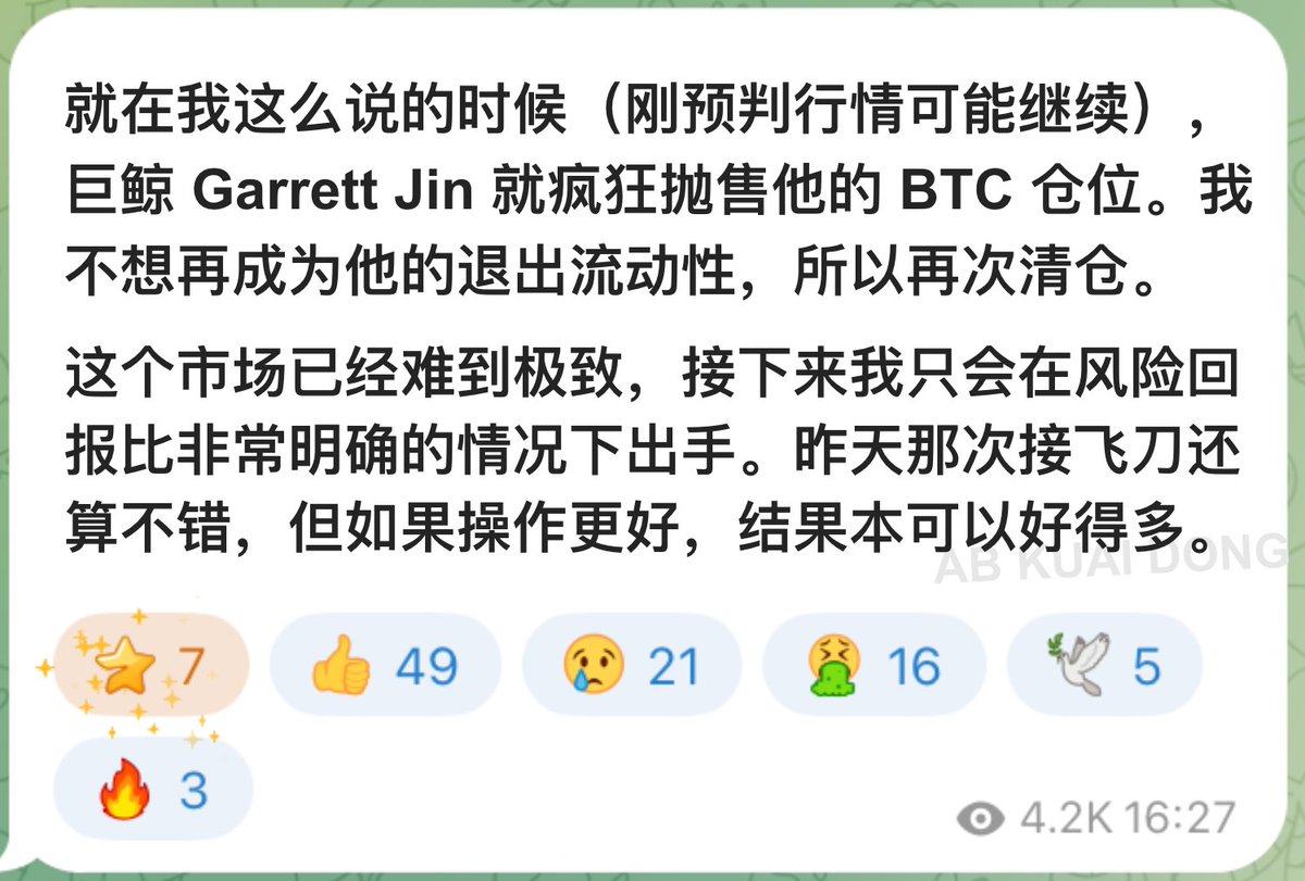 传奇交易员鸽子 Eugene,也注意到了这个事情,表示先把昨天抄底的仓位,直接平仓不玩了,等巨鲸卖完比特币的。 今天,链上分析师爆料巨鲸 Garrett Jin 与易理华,用的是同一个币安充值地址,然后 Garrett Jin 正疯狂向币安转移比特币,疑似准备抛售。