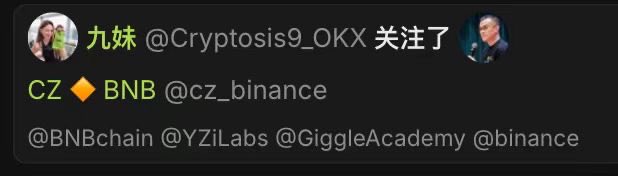 九妹儿 @Cryptosis9_OKX 开始下场整活了?还是真心归一了?商战到了白热化吗?还是和解啦?我希望下一步cz星星相互关注,何一九妹相互关注🫂加密大团结万岁🎉