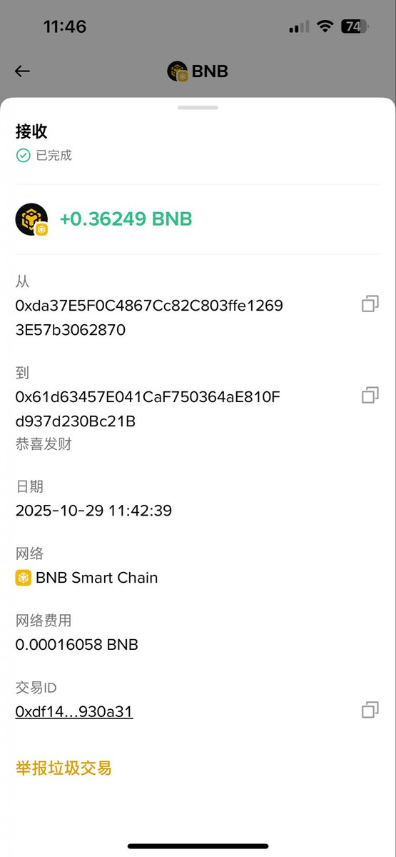刚才收到了 @binance 发的钱,0.36249bnb,400美金,差不多3000块,普通人小一个月的工资💰