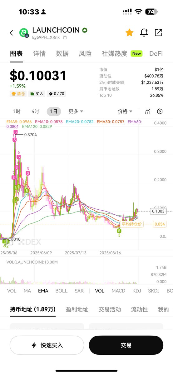 $launchcoin 目前给我的感觉也差不多,比较有性价比的抄底位置我是设置在50M-80M区间,但是这个币的看好共识目前也很强,已经盘整了23天了,没有跌到位就一直有人在抢购,但是这几天的日线又都是这种很短的k柱实体+长上影线,给我的感觉不是很强势。这个叙事我一开始也估值能高于1B市值,这是对标去年行情很好的时候出现的其他币,比如$ai16z,至于这个币最后怎么走我也没法预言,但是我的原则是不到理想位置宁愿踏空也不会重仓买入。