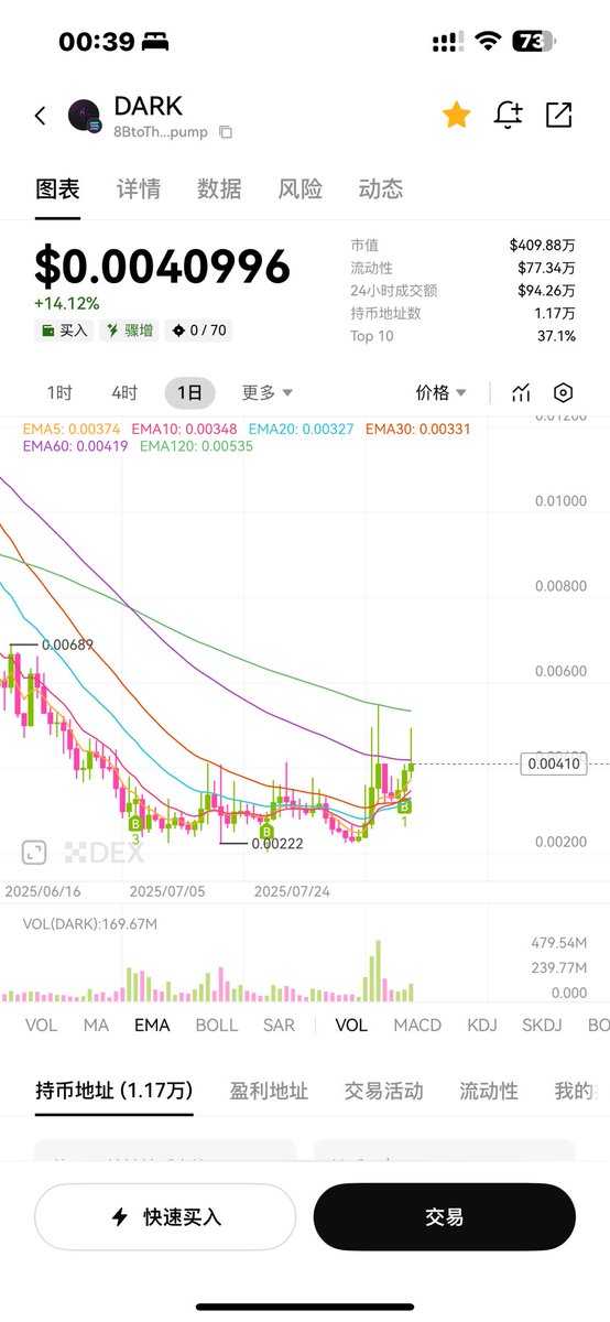 比如$dark,我是非常看好有二段机会的,我的预期抄底位置是5M-7M市值,而横向对比去年一些基本面类似的AI币,下跌调整即使耗时长的也基本都在一至二周内结束,但是$dark居然在10m市值以上撑了一个月,一到这个支撑位就有散户抄底,我也试仓了几次最后看k线走的实在太差了就放弃了。