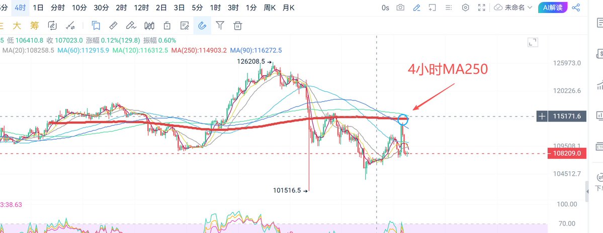 这里的走势主要是磨叽,你要说能跌多少多少,现在看不出来。104000是250日线的大支撑位,这条线是23年初15000到现在25年末11万这近4年的大支撑线,也就是说大饼一直是沿着250均线持续涨了4年,从未有效跌破过所以说完全看跌也不会,想做趋势空单的等破了这根线再说,想做多等小级别均线走顺。目前的节奏就是日内反弹空