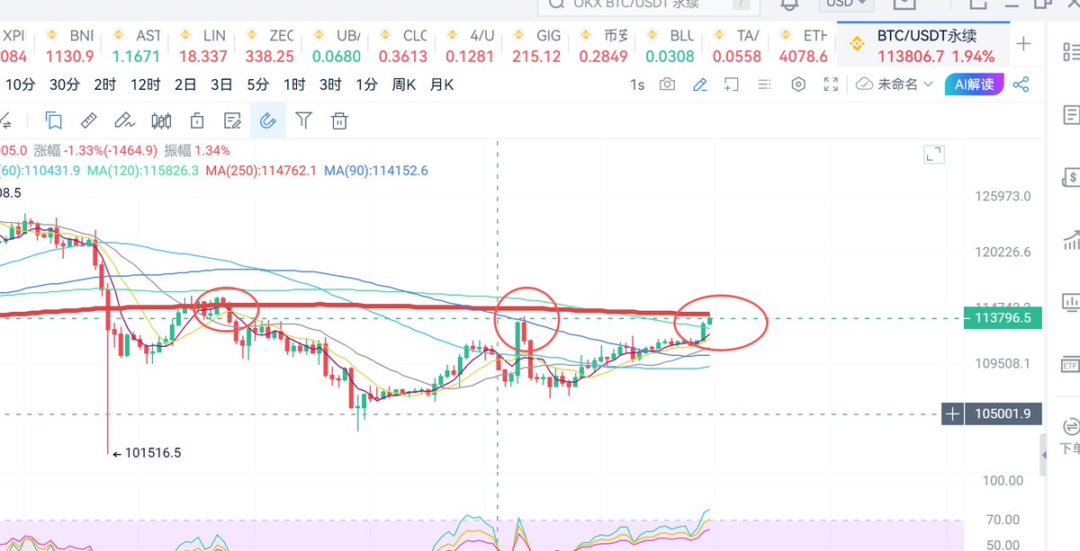 昨天收到消息面刺激价格反弹至113900,前天我们给出的反弹极限值是114200,这两个数值非常的接近,很大的原因是这根线4小时MA250是市场上最重要的最重要的均线,能突破这根均线的前提是所有小级别的均线例如MA5 10 20 这些能够走顺,走出明显的多头排列在这之前依然是反弹空为主。