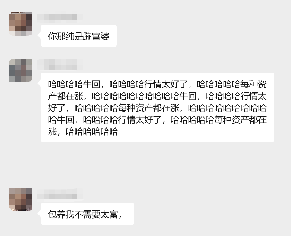 黄金压境,群里调侃笑谈😂吓煞一干众人。 A:比特币还有春天吗? B:余生只剩寒冬。 只增笑耳。