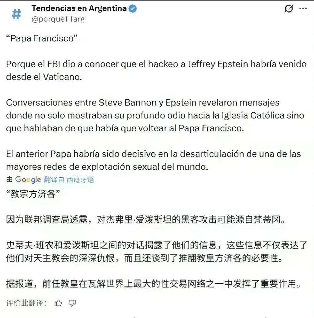 读起来让人倍感魔幻魔幻的剧本:方济各率领宗教圣徒用先进的技术手段大战黑暗堕落的爱泼斯坦萝莉岛魔鬼。