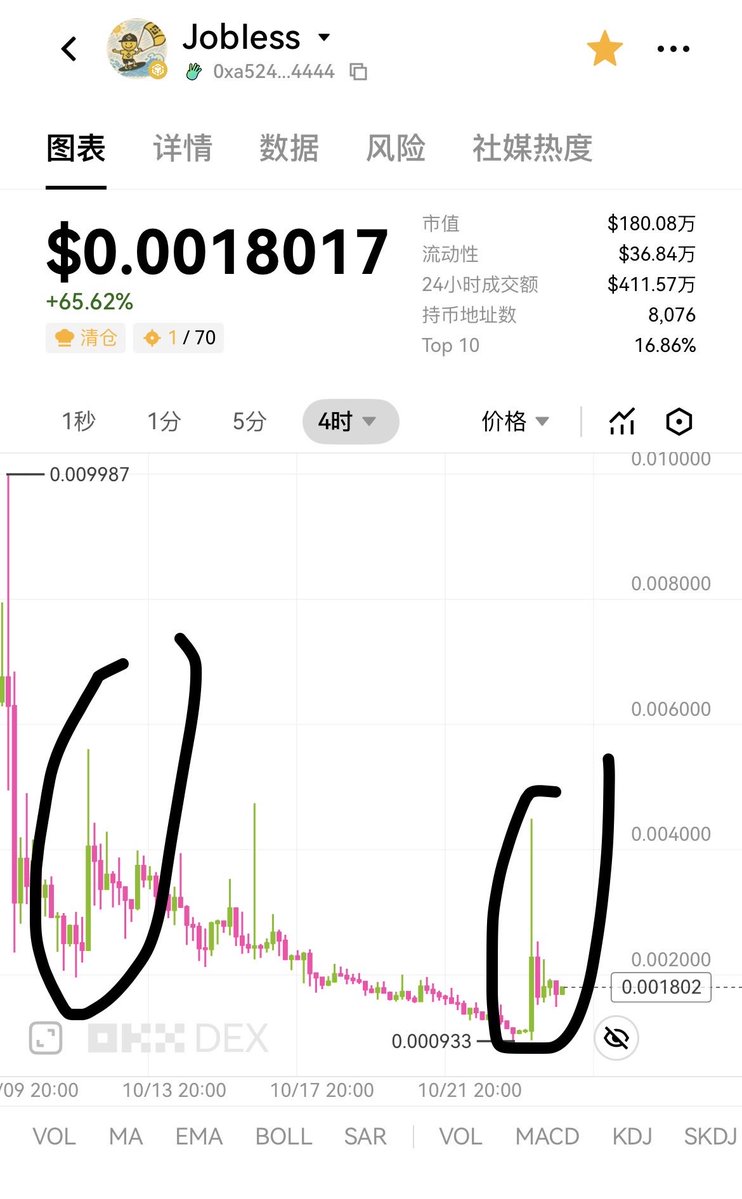 第一次最开始大表哥转发引用发文:jobIess,but taking the initiative.之后各个官推争相二创,一度涨到5m,风头正盛的时候经历了风流,之后一度跌破1m.