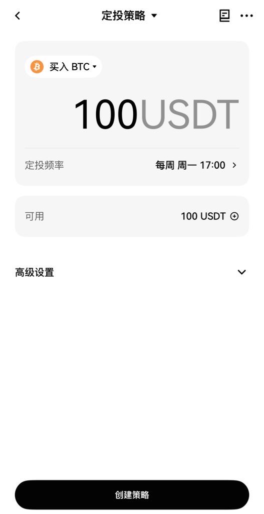 有欧易账户的在【交易】-【策略交易】中找到【定投策略】,可以自定义想要定投的币种和频率。比如每周定投100美金BTC或者ETH。