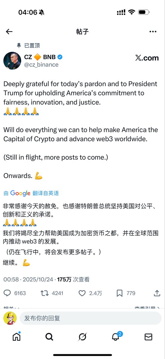Deeply grateful for today’s pardon and to President Trump for upholding America’s commitment to fairness, innovation, and justice. 🙏🙏🙏🙏 Will do everything we can to help make America the Capital of Crypto and advance web3 worldwide. (Still in flight, more posts to come.)