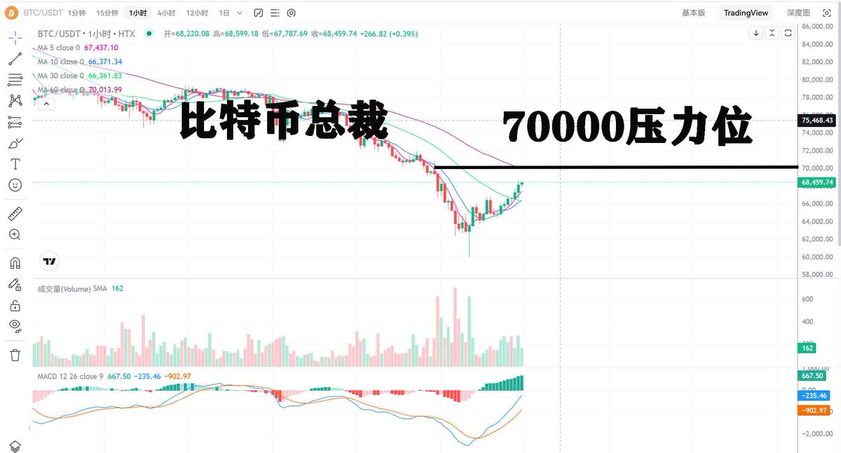 比特币从1小时级别来看,K线开始探底回升,形成V型底反攻,但反弹即将触及MA60,即70000大关,若不能突破站稳7万,容易出现冲高回落,迎来二次回踩,因此靠近70000附近不建议去追涨 #BTC #比特币