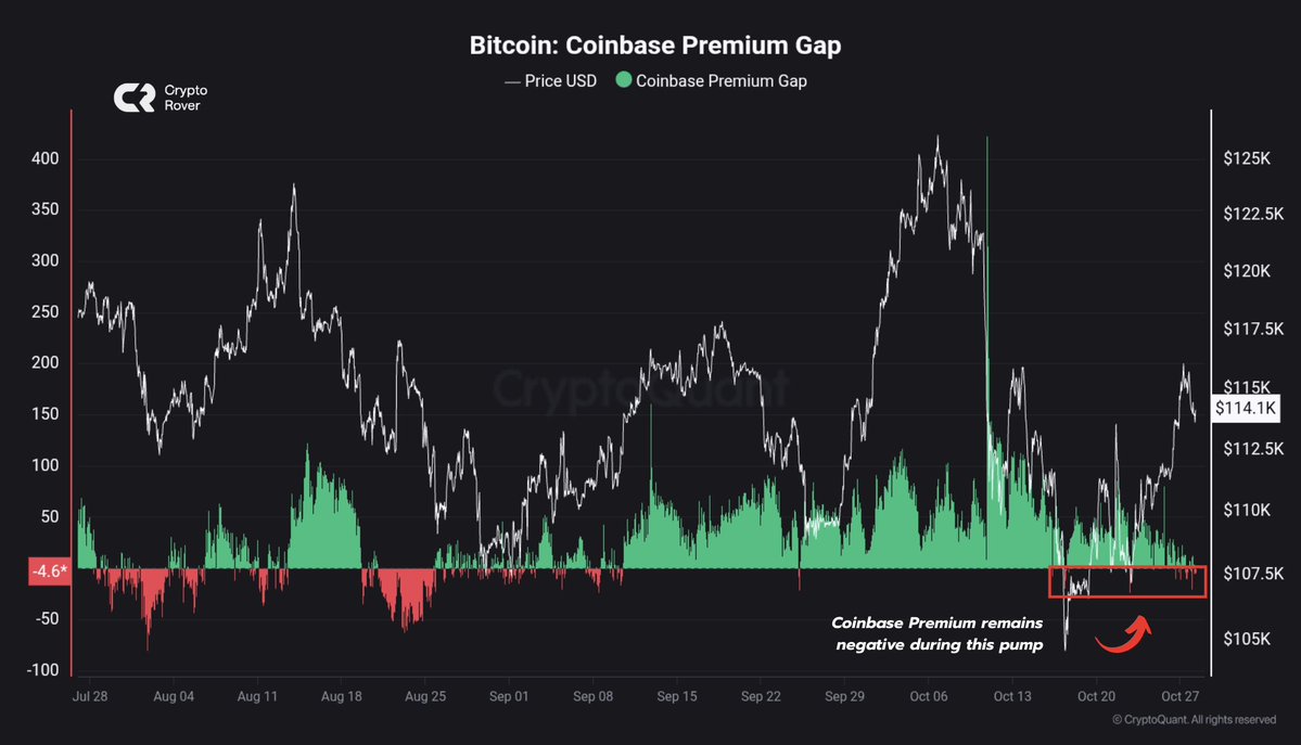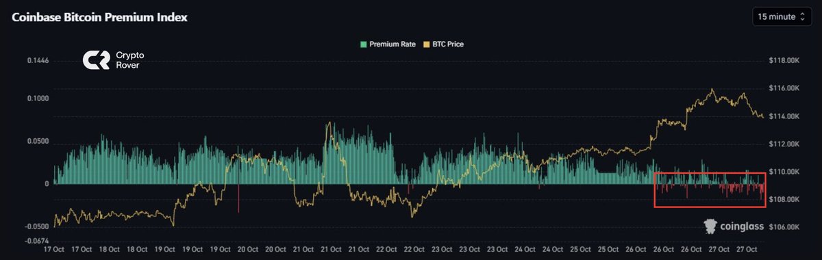 在比特币最近的上涨期间,Coinbase 溢价保持为负值。