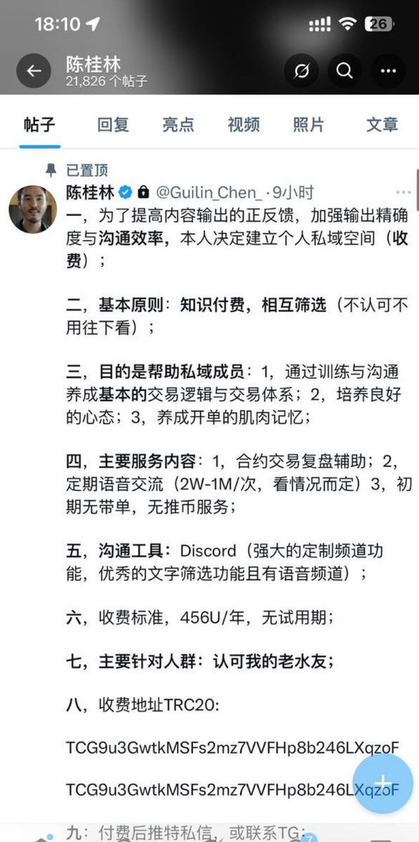 这个陈桂林是倪狗@Phyrex_Ni KOL小团队的成员,此前我揭露过此人是诈骗犯,其最开始晒的交割单都是模拟仓,基本每单都是大赚,立人设一段时间后开始收费8000多U一年,估计之前是股票圈的诈骗犯,上来就敢收这么高的价格,后来发现定价太高割不到韭菜,于是沉淀了一段时间,这期间倪狗帮其进行大量引流,从倪狗那拿到了不少粉丝;