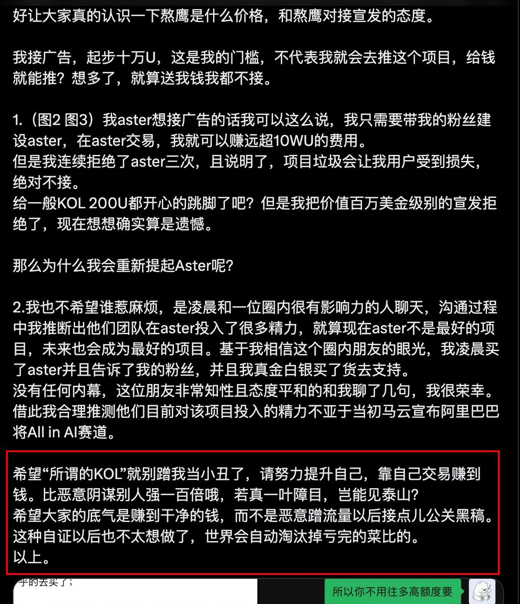 所以就aster而言,首先是aster项目方感觉到项目快黄了,没人玩了,但觉得这项目还有继续割韭菜的价值,所以决定花点经费找一波KOL进行项目宣传;