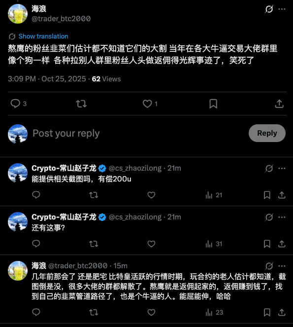 有人反馈熬鹰当年混迹各种群里拉人头做返佣,原来是靠这个起家的啊,所以就是无限子弹打合约,总能打出来一次,然后就开始吹牛逼,靠收割粉丝流动性来赚钱了;