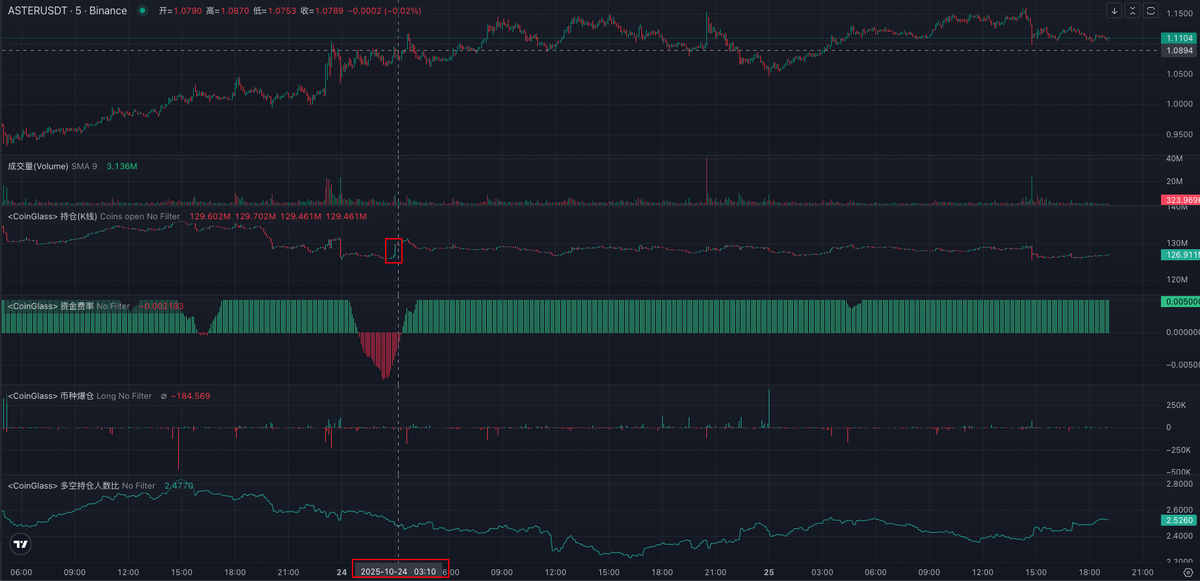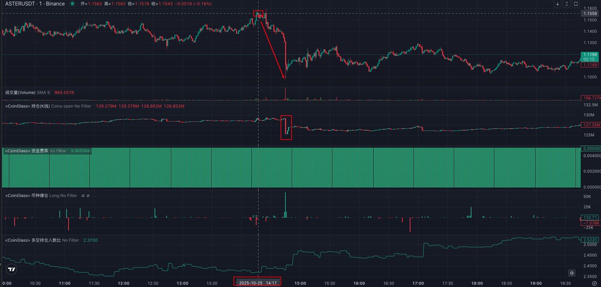 根据其成本和仓位大小情况,再查看币安aster持仓的变化情况,可以确定其是在24号凌晨3点附近建仓的,因为凌晨3点币安合约持仓突增300多万刀,价格是1.08附近,基本符合其建仓500万U的操作,大家可以自己去复盘一下;
