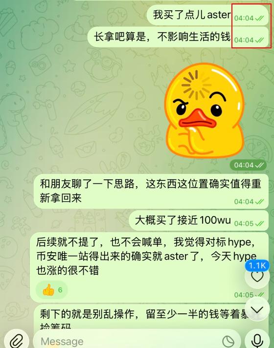 图三:【第二步:返佣群死忠粉先为其抬轿】在其建完仓后,凌晨4点,其在返佣群中说自己觉得aster不错,买了100万U的aster并准备长拿,这是先忽悠返佣群内的死忠粉为其接盘;