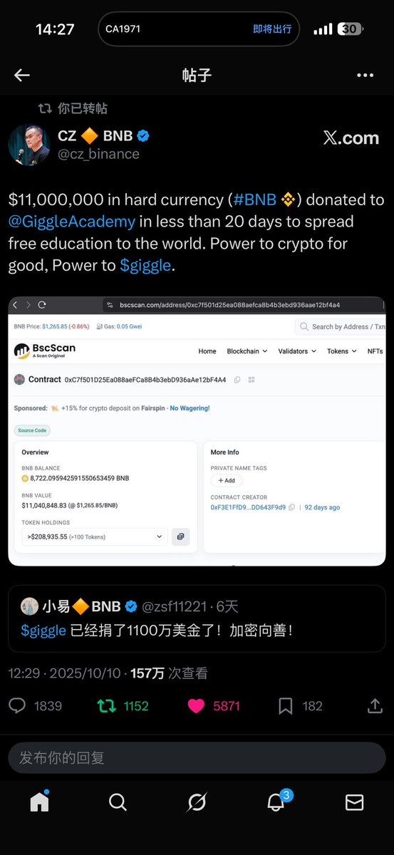 $GIGGLE 出来也就一个多月,就成为了这7个月来币安首个也是唯一一个上现货的meme项目,并且还是周六上线的,上完现货就开通了理财及质押(同期上线的 $F 未开理财,$F 上现货的一个原因是已经上完upbit 了)由此可见,币安对 $GIGGLE 是不一样的,一路开绿灯(那么?币安会不会发布公告捐出 $GIGGLE 现货的交易手续费支持这份慈善事业呢?以一姐对表哥的爱,必支持大表哥的终身事业)或者说难道大表哥的终身事业就这,我不带脑子想也笃定答案是不可能的!so,不要慌(主要是慌也没用😬