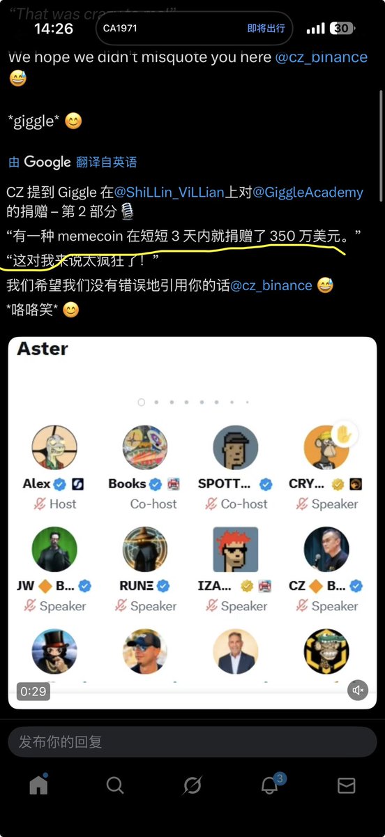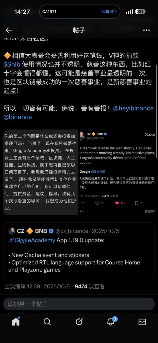 Cz大表哥挂推特Tittle的项目就4个,YZI,GIGGLE BSCChain BNB就这4个