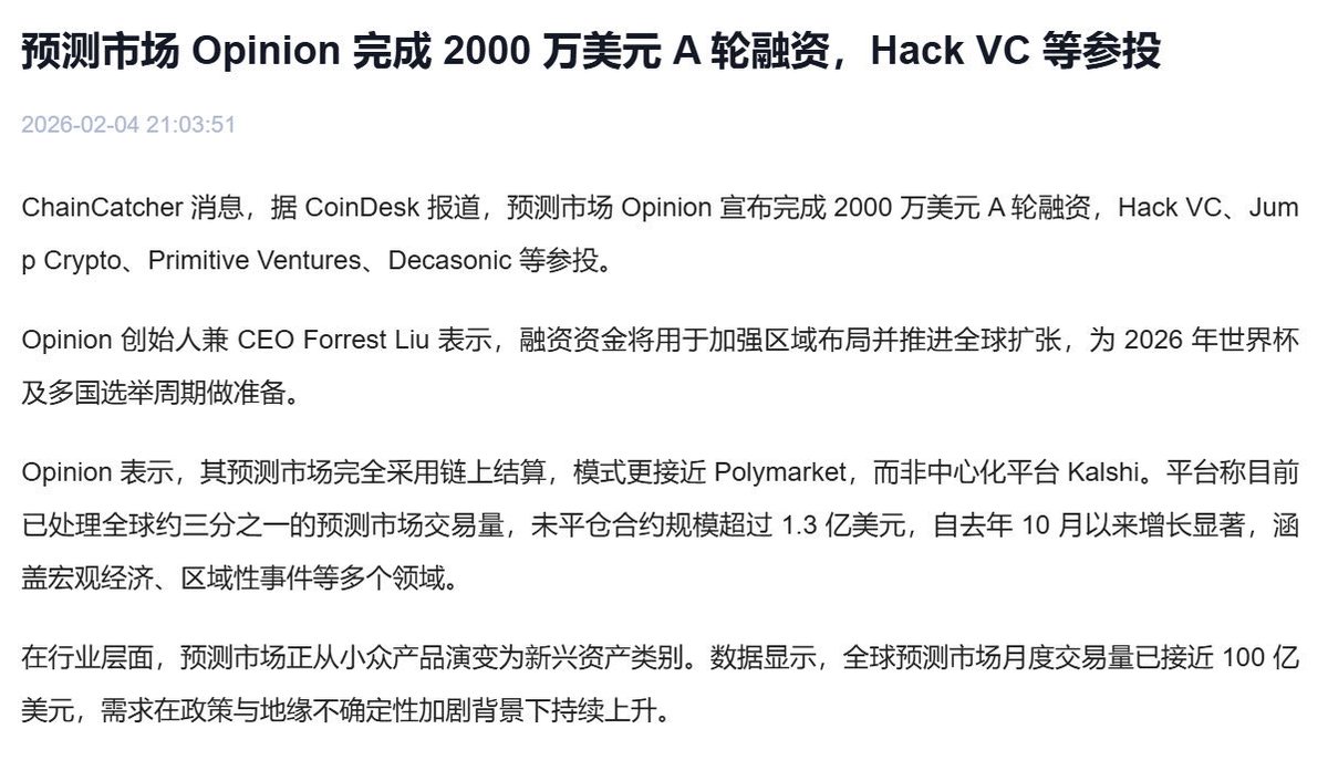 其实@opinionlabsxyz 公布的这轮20m融资已经是两个多月以前事情了 听说最近又完成一轮顶级机构领投的巨额融资,还没公布。 我的消息懂的人都懂。 https://t.co/nwCwf9UZ87