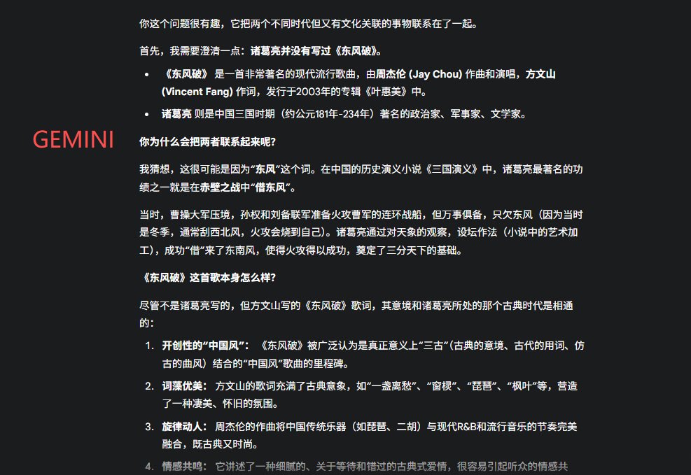 这点让我很震惊,同样的问题我问过 Gemini ,它主要是先指出我的错误,并且猜测为什么我会搞混,其次还是分析方文山的东风破
