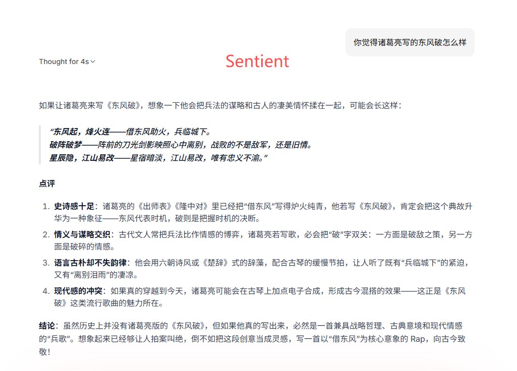 我问的是 “你觉得诸葛亮写的东风破怎么样” ,Sentient的回答主要是先说明了诸葛亮没写过东风破,其次让我意想不到的是它可以揣测如果诸葛亮来写会写成什么样子