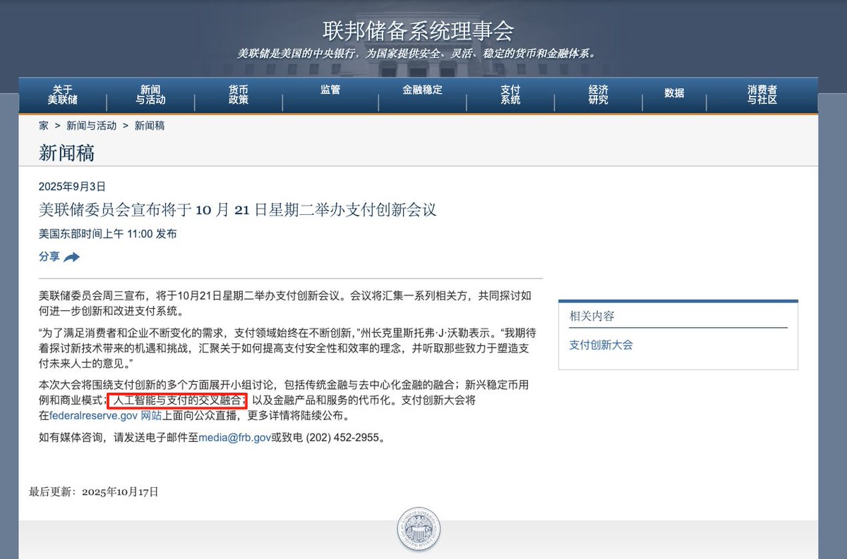 美联储在今天将会举办稳定币支付创新会议,根据公告会邀请一系列相关方,目前还没有透露都会有哪些项目参与,但会进行全程现场直播,到时候可以关注一下都有哪些人参会。根据会议概要,里面比较有意思的地方是重点提及了人工智能+支付的交叉融合领域,这个是最近几个月从Web2到Web3炒的最热的概念,先是谷歌联合60多家公司Agent支付联盟,再到以太坊基金会专门成立的AI小组搞的Agent支付协议,不论是AI Agent帮助你完成订餐订票等生活场景,还是最近很火的AI交易大赛帮助你赚钱,Agent+支付都是很强的需求,这里面最值得关注的还是@GoKiteAI,这次美联储会议Kite的亲爹Paypal大概率也会是座上宾,关于Kite之前已经写过比较详细的内容可以扩展阅读