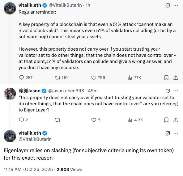 Vitalik的回答很简单“正是因为这个原因,Eigenlayer依赖于用自己的代币进行主观标准的罚没”。
