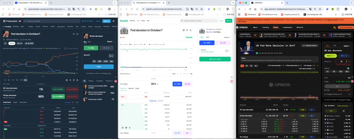 今晚又到美联储激动人心的开奖时刻了,根据目前三大预测市场的数据降息25个基点应该是板上钉钉了,目前这个话题Polymarket、Kalshi和Opinion的交易量分别是2.2亿、3400万和1400万,刚上线没多久的币安亲儿子@opinionlabsxyz已经坐稳第三大预测市场了,而且按照这个趋势超过Kalshi应该没什么问题,另外Opinion是这三个里面唯一小数点后精确到1位的,这个精度还是做得不错的比较友好。